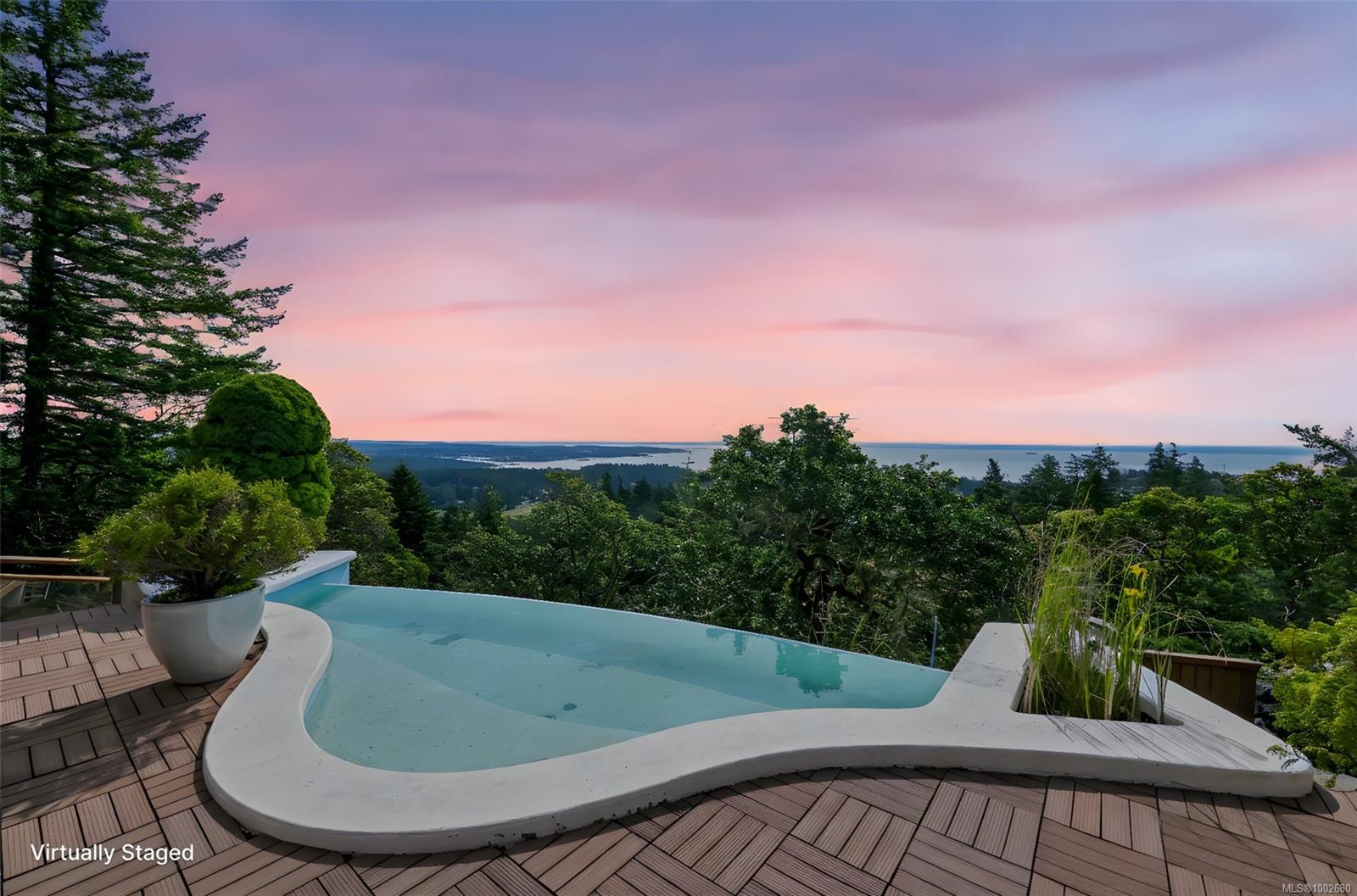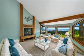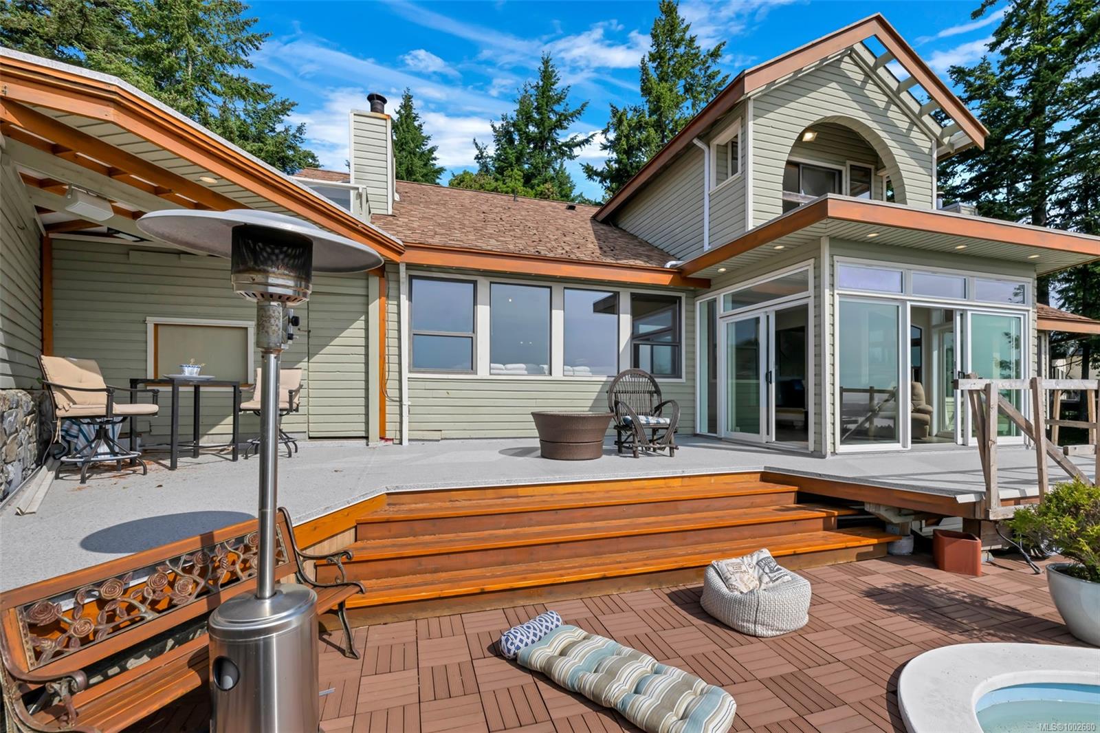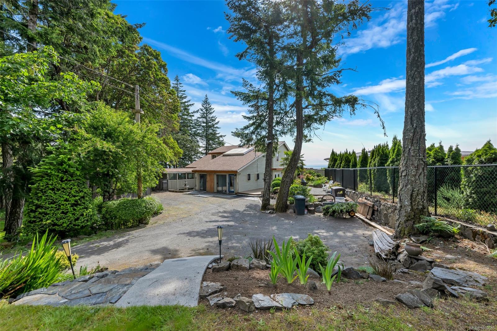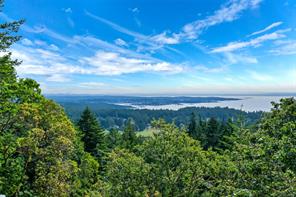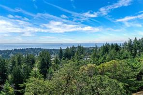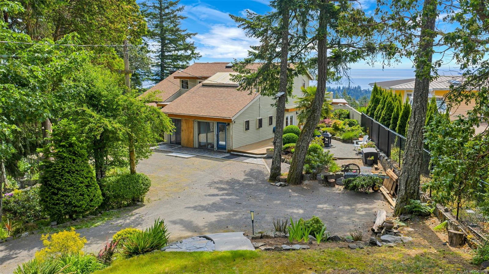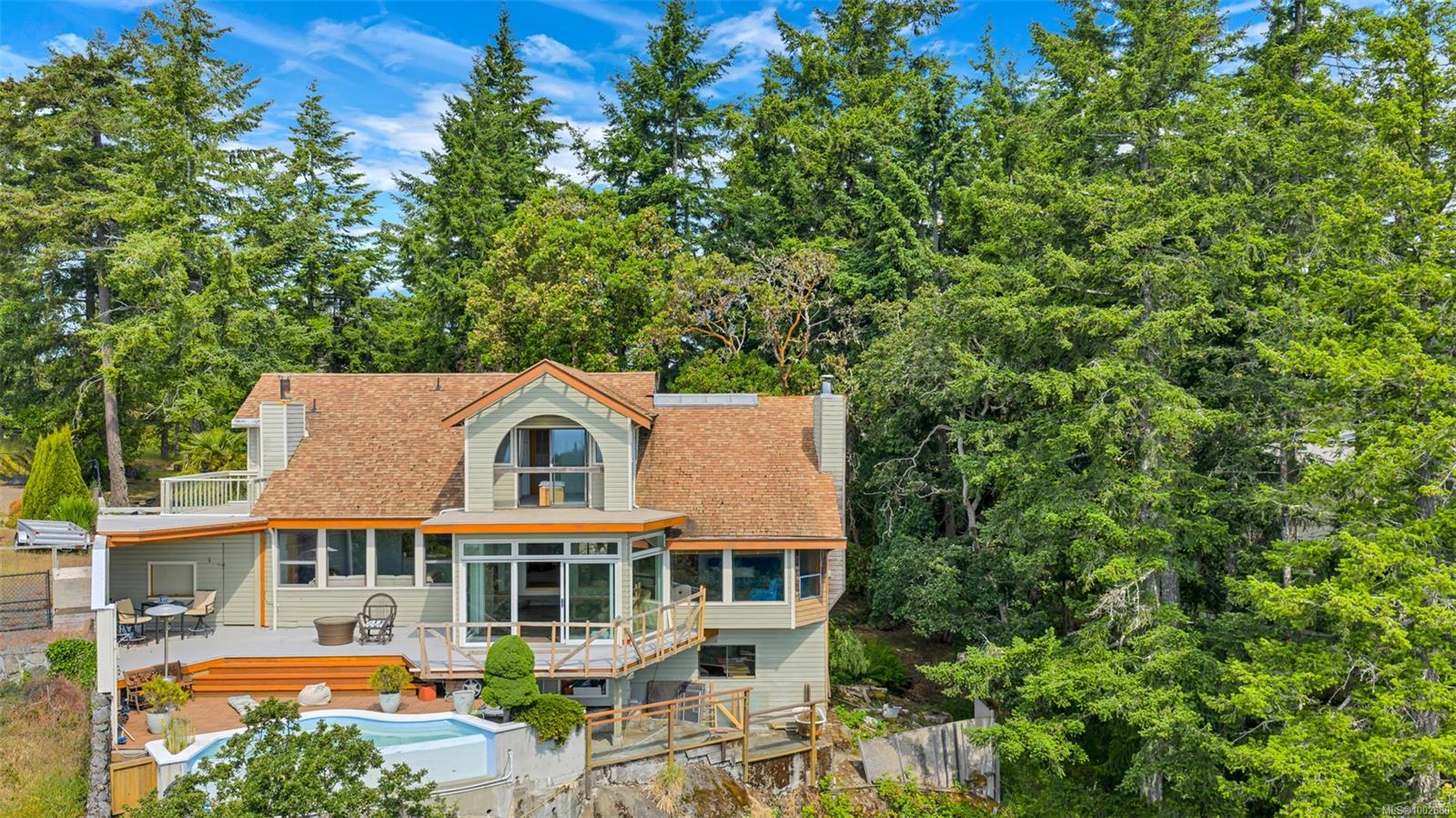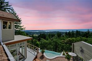 Triangle Mountain Acreage, where the sky meets the sea, this custom West Coast home offers sweeping views from the Olympic Mountains to Downtown Victoria. The feature dining area with slated tile floor is the heart of the home framed by floor-to-ceiling windows, letting you soak in every sunset. Upper landing overlooks the lower living spaces with light pouring in through the glass feature skylight. Several bedrooms, luxury bath and laundry conveniently located on the top floor. Primary has walk-in closet, enclosed sunroom, ensuite and a bird’s eye view deck for gazing at the lights of Victoria as you fall asleep at night! Outside discover peaceful garden pockets, a tranquil water feature beside a mature palm tree and your exclusive private plunge pool—sundeck perfect for unwinding while taking in the views. Cozy wood-burning fireplaces and tiled floors add warmth and character inside. While the home could use some updates, it presents the perfect opportunity to make it your own.