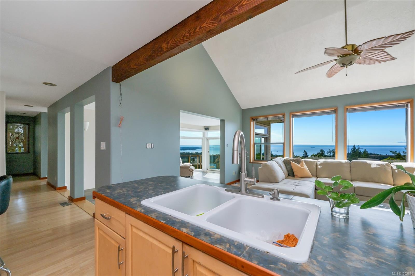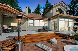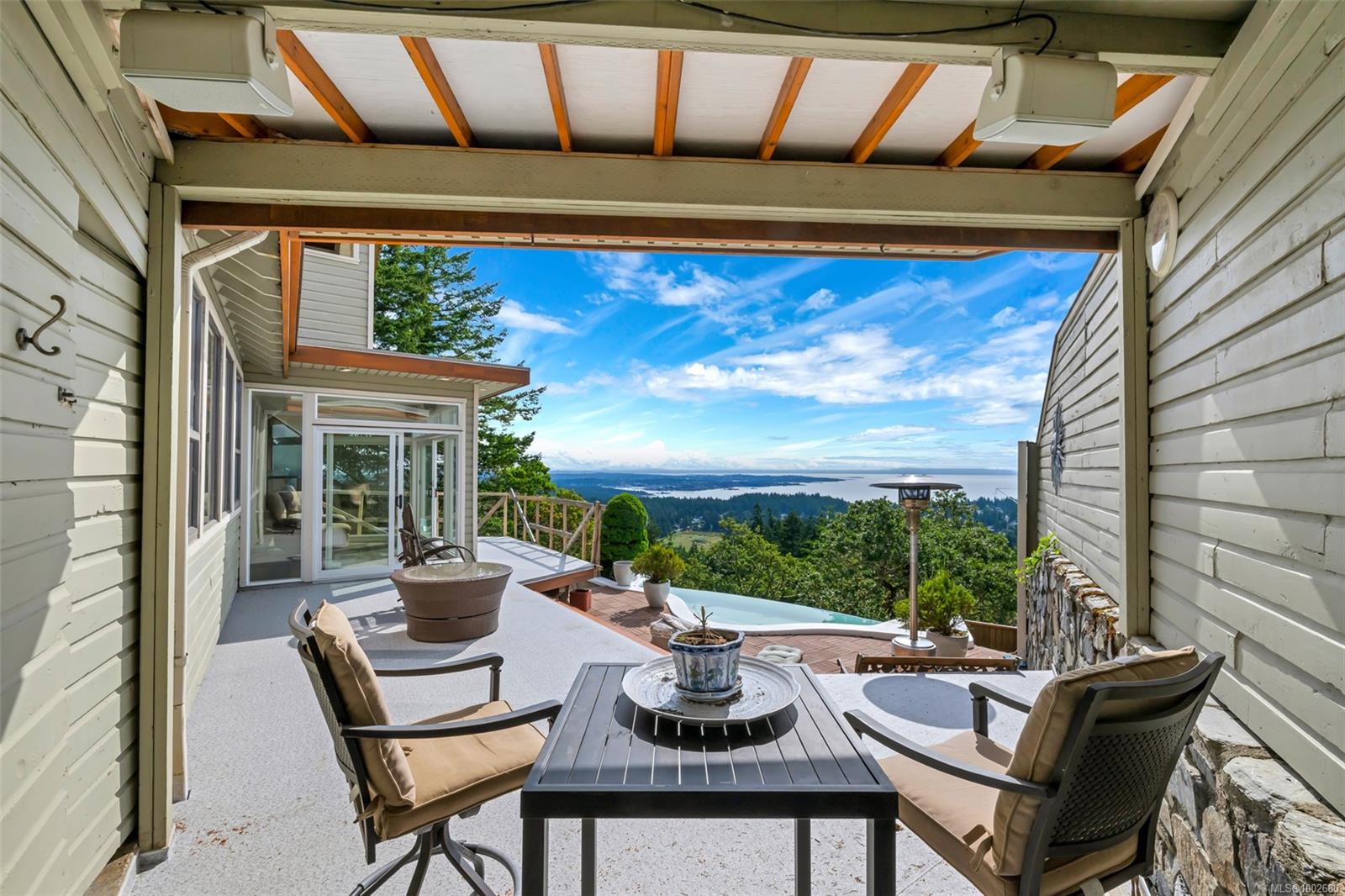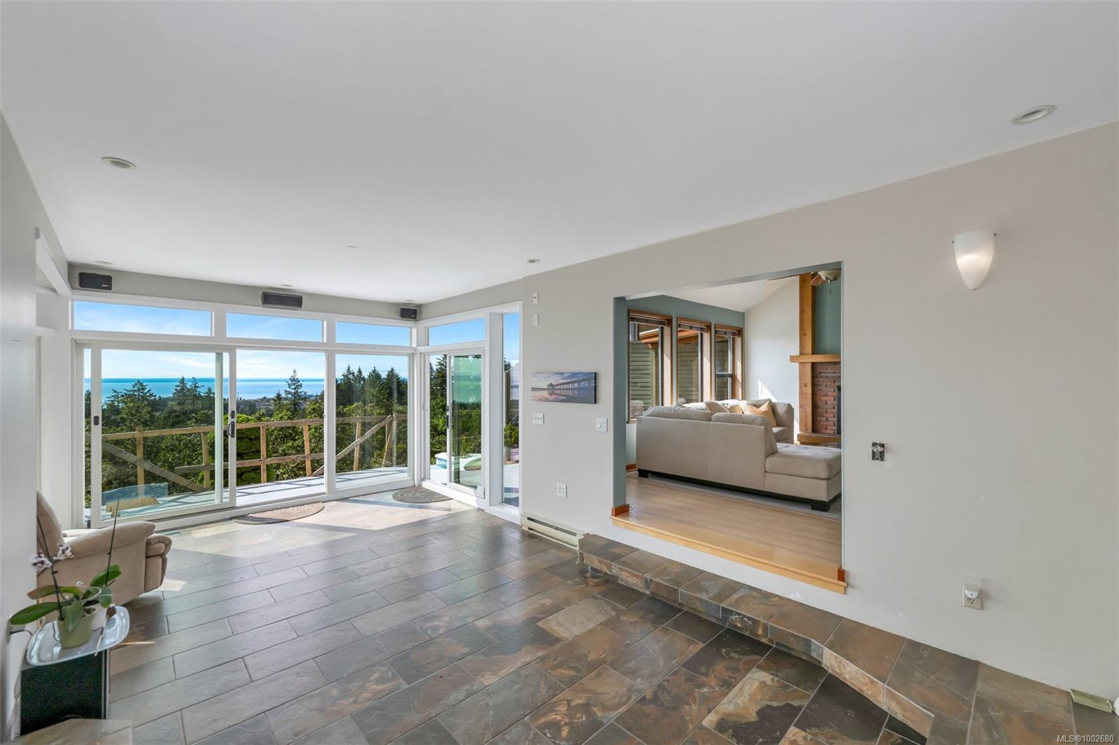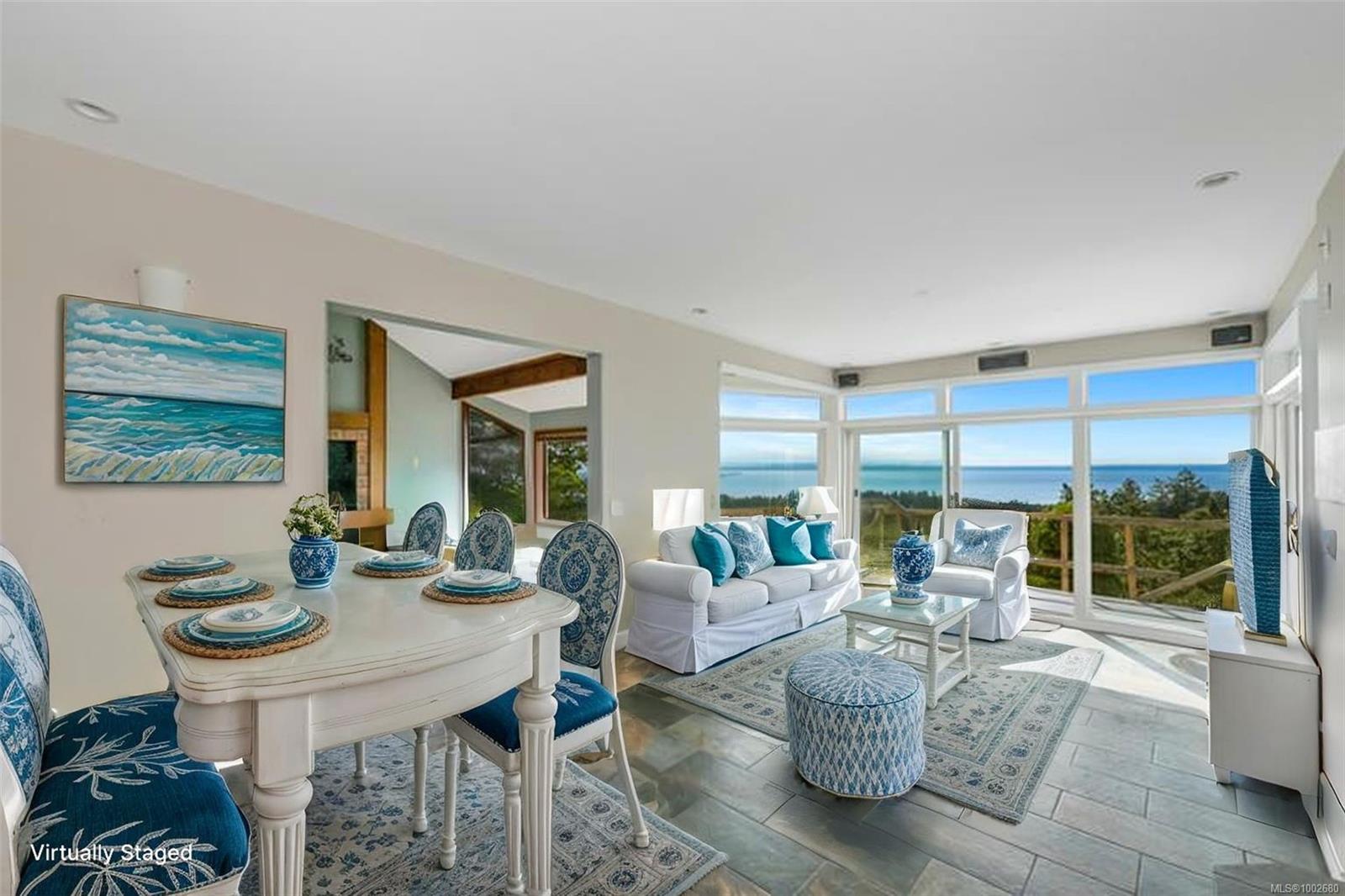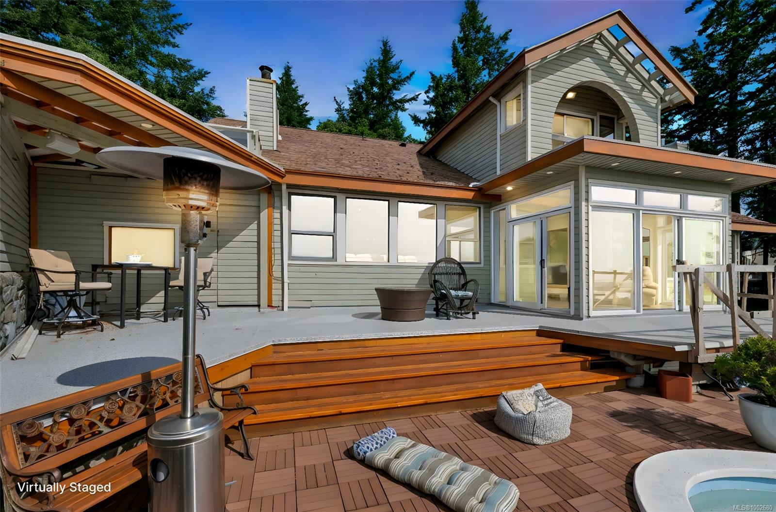 Triangle Mountain Acreage, where the sky meets the sea, this custom West Coast home offers sweeping views from the Olympic Mountains to Downtown Victoria. The feature dining area with slated tile floor is the heart of the home framed by floor-to-ceiling windows, letting you soak in every sunset. Upper landing overlooks the lower living spaces with light pouring in through the glass feature skylight. Several bedrooms, luxury bath and laundry conveniently located on the top floor. Primary has walk-in closet, enclosed sunroom, ensuite and a bird’s eye view deck for gazing at the lights of Victoria as you fall asleep at night! Outside discover peaceful garden pockets, a tranquil water feature beside a mature palm tree and your exclusive private plunge pool—sundeck perfect for unwinding while taking in the views. Cozy wood-burning fireplaces and tiled floors add warmth and character inside. While the home could use some updates, it presents the perfect opportunity to make it your own.