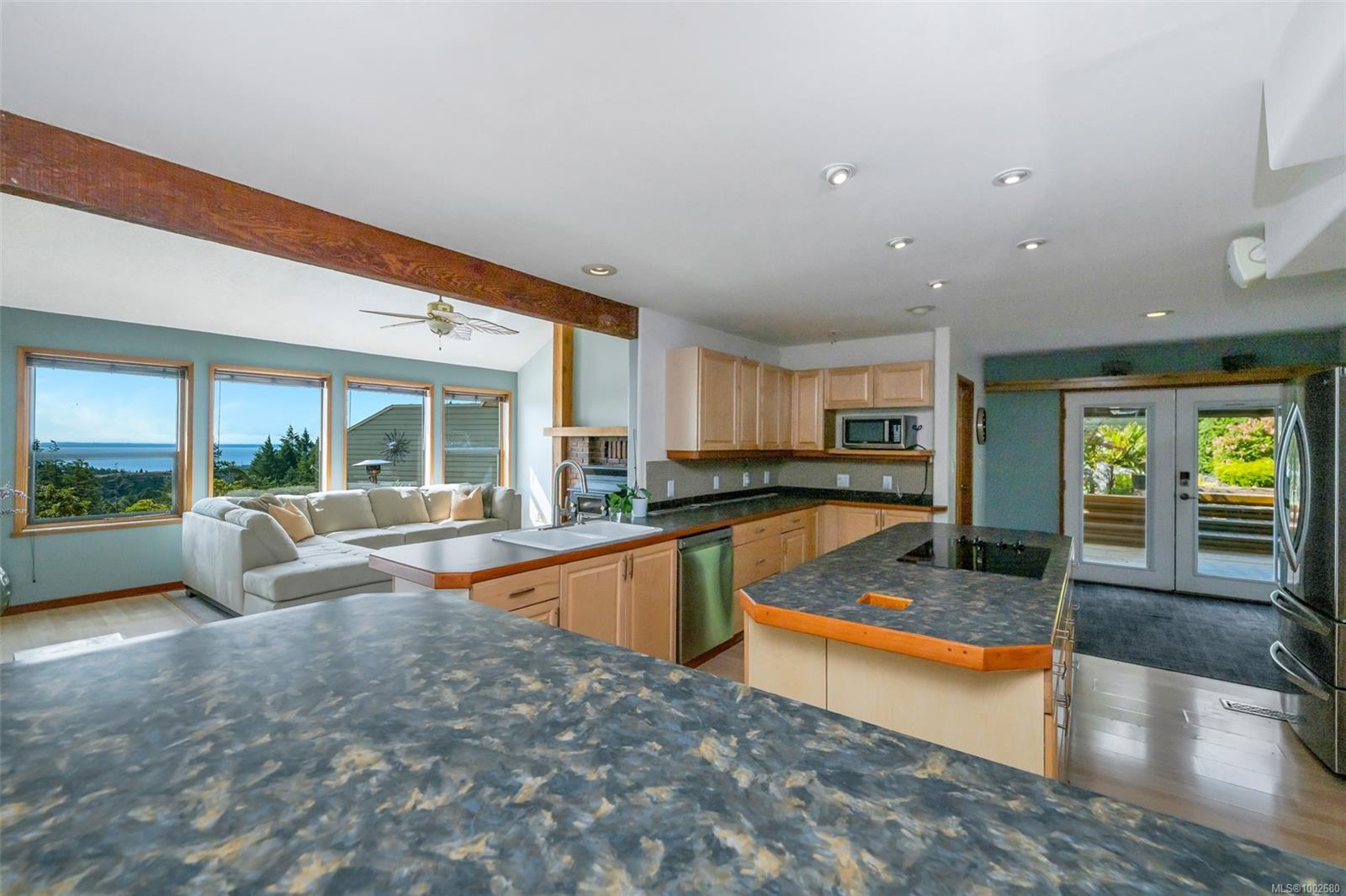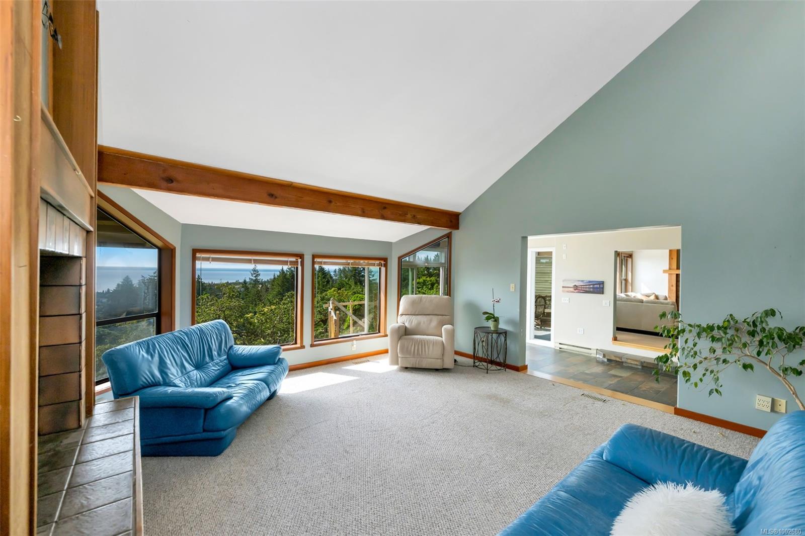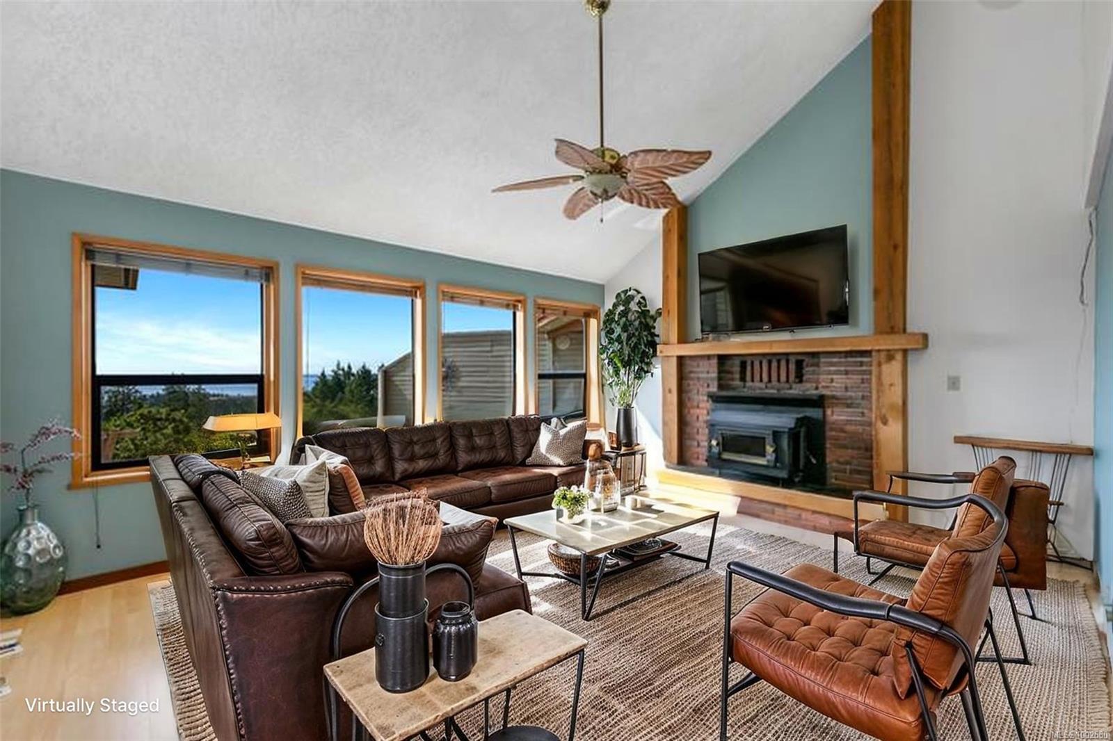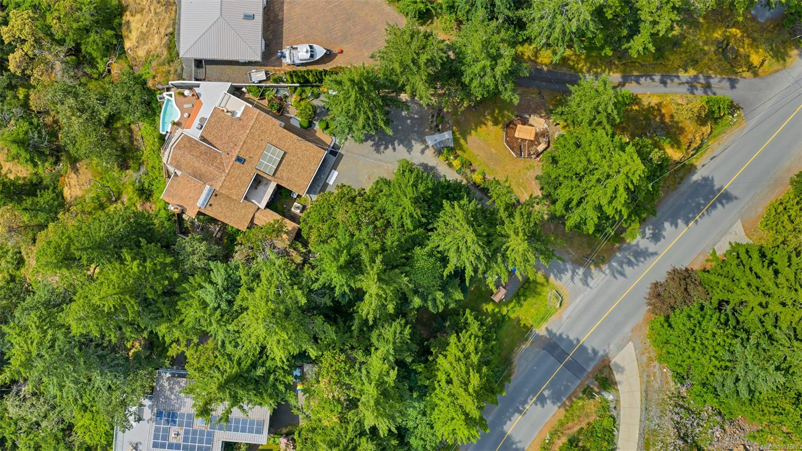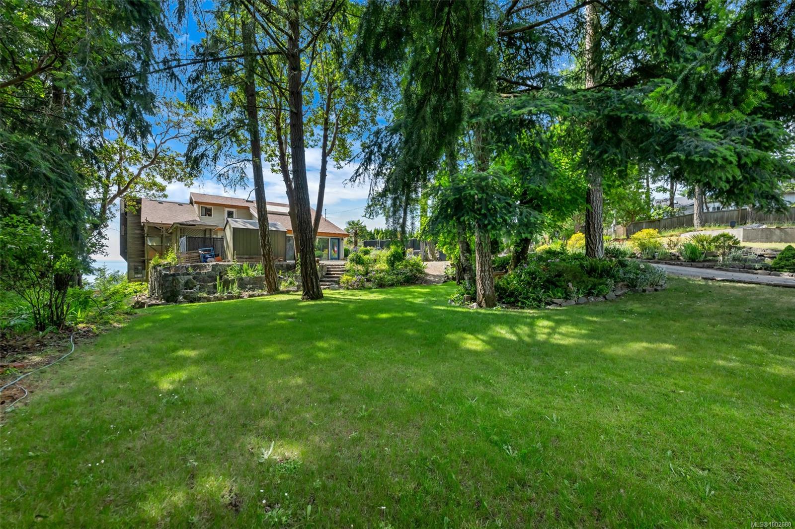 Triangle Mountain Acreage, where the sky meets the sea, this custom West Coast home offers sweeping views from the Olympic Mountains to Downtown Victoria. The feature dining area with slated tile floor is the heart of the home framed by floor-to-ceiling windows, letting you soak in every sunset. Upper landing overlooks the lower living spaces with light pouring in through the glass feature skylight. Several bedrooms, luxury bath and laundry conveniently located on the top floor. Primary has walk-in closet, enclosed sunroom, ensuite and a bird’s eye view deck for gazing at the lights of Victoria as you fall asleep at night! Outside discover peaceful garden pockets, a tranquil water feature beside a mature palm tree and your exclusive private plunge pool—sundeck perfect for unwinding while taking in the views. Cozy wood-burning fireplaces and tiled floors add warmth and character inside. While the home could use some updates, it presents the perfect opportunity to make it your own.